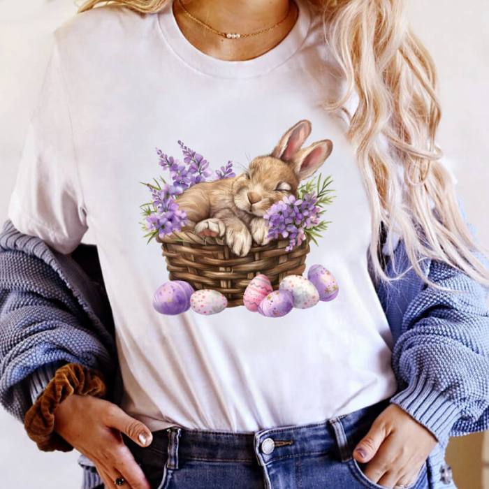Acest tricou adorabil aduce o notă de gingășie și relaxare, având un imprimeu artistic cu un iepuraș adormit într-un coș cu flori de lavandă și ouă de Paște pastelate. Designul delicat și culorile calde îl fac perfect pentru sărbătorile de primăvară sau pentru un look casual plin de farmec.